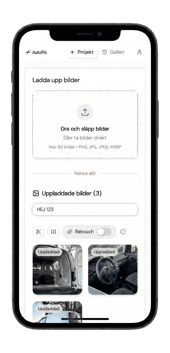 Ta bilder direkt med telefonen eller ladda upp från galleriet.